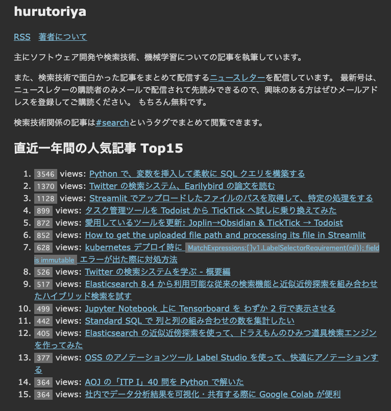 このサイトは、静的サイトジェネレーターの Hugo を使って構築している。 だが静的サイトジェネレーター(SSG)は、アクセスログを利用した人気記事機能を提供しておらず、自分のサイトでも提供してみたいけど、SSG からは公式には提供されない機能… と思っていた。 だが、フューチャー技術ブログさんのサイトを見ていると静的サイトジェネレーターを使っているはずなのに人気記事機能を提供しており、ソース1をみてみると、あ、そうか自分の Google Analytics のデータを使えばできるんだなと目からウロコの気持ちになり、今回のスクリプトを書いた。