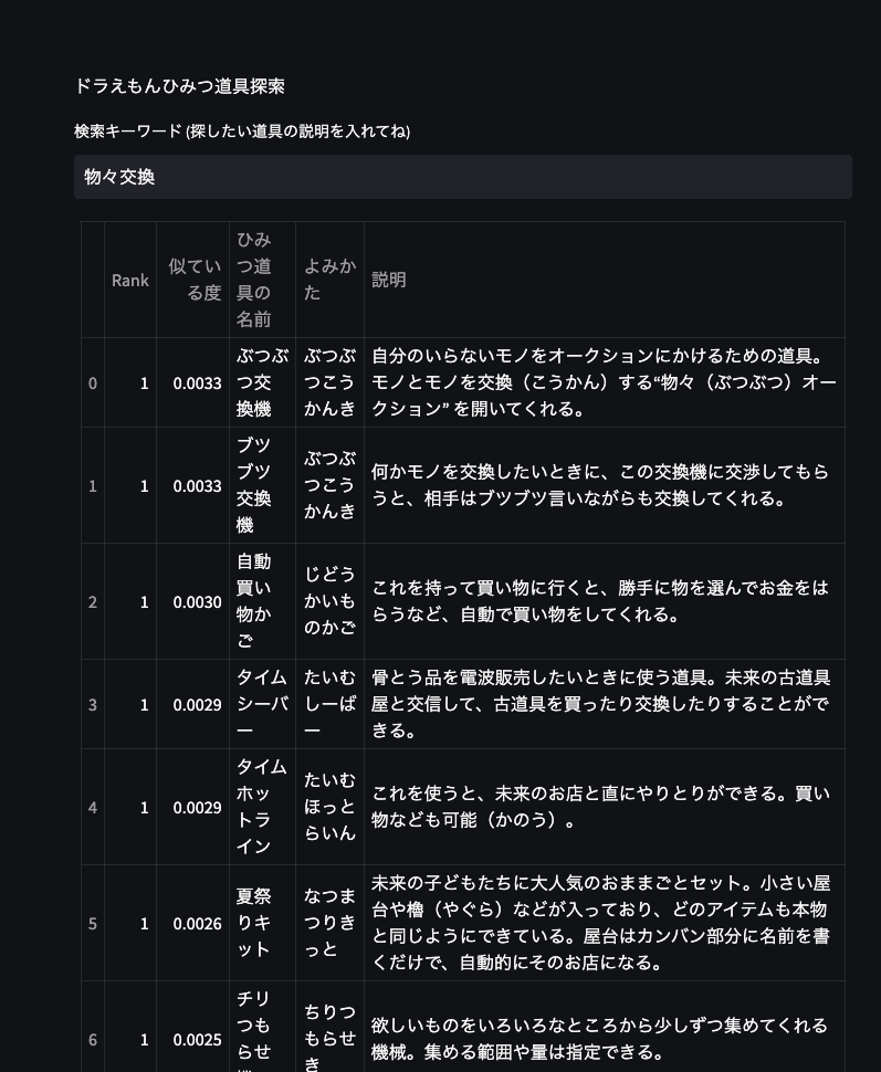 デモ動画のように、検索したいひみつ道具を説明する文章することで近しいひみつ道具が検索されます。
