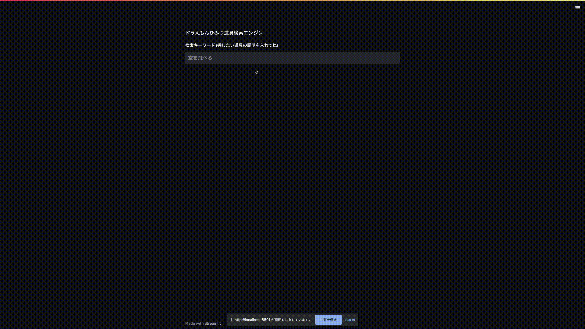 デモアプリの構築は streamlit を使って20mくらいで作れたので、相変わらず便利すぎて愛用している。今回の検索エンジンはCLIから実行もできるが、こうやってデモアプリがあったほうがそれっぽくて気持ちいい。