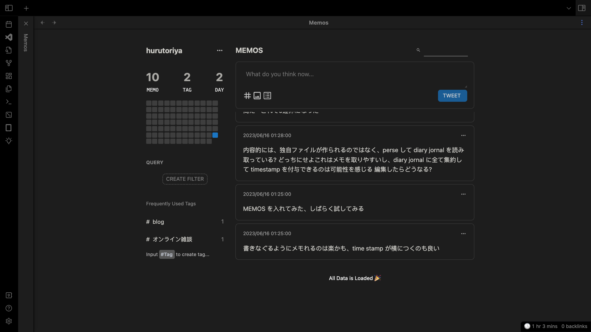 Daily Noteを読み取って、Memos を構築している模様。これがめちゃくちゃ良い。つまるところ Memos は単なるインターフェースで投稿した内容は全てDaily Noteに結合されて素のプレーンテキストとして管理できるし、日誌が完成されていく。なんか火星の人の Log entry みたいで気に入った。 - 書きなぐるようにメモれるのは楽だし、time stamp が横につくのも良い。Memos を使ってみると意外と今までの