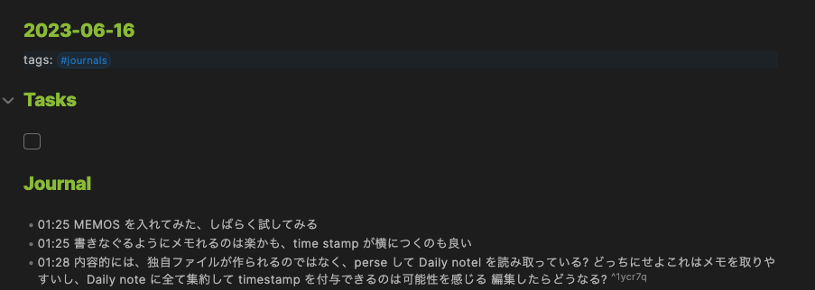以下、こんな感じで daily journal にlist or task形式で書き出されていく
